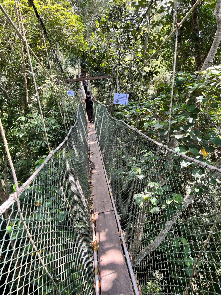 The experience in Teman Negara was quite different. You are restricted to a path cordoned off on either side. It is certainly good for the forest not to allow tourists to go traipsing around. But the sense of danger and adventure was lost. It was a sterile experience. The rope walkways, all part of the tourist trail, take you up to levels above the trees until you’re looking down at the canopy of ancient trees. All very exciting but in a packaged kind of way.